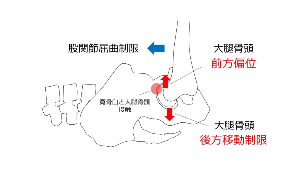 後方に移動しない場合には、寛骨臼と大腿骨頭が接触することにより屈曲は制限されてしまいます。
