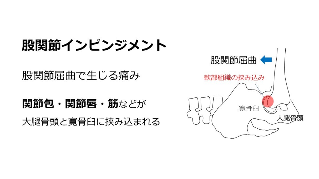 関節包・関節唇・筋などの股関節前面の軟部組織が大腿骨頭と寛骨臼の間で挟み込まれることによって生じることが痛みの原因とされています。